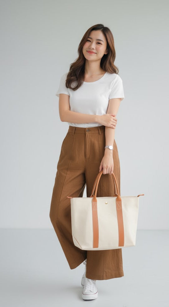 Áo sơ mi trắng + quần linen màu da bò = phong cách công sở sang trọng