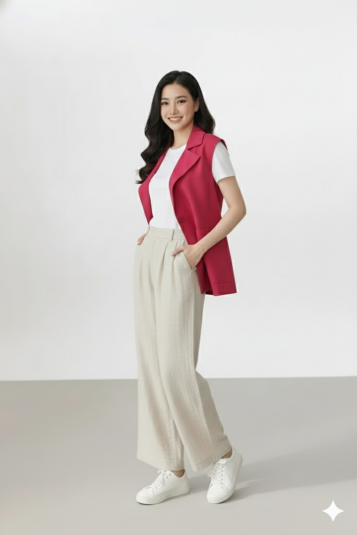 Phối đồ gợi ý: Mặc riêng như áo vest không tay, phối cùng quần suông, chân váy midi, hoặc layer cùng áo thun đơn sắc.