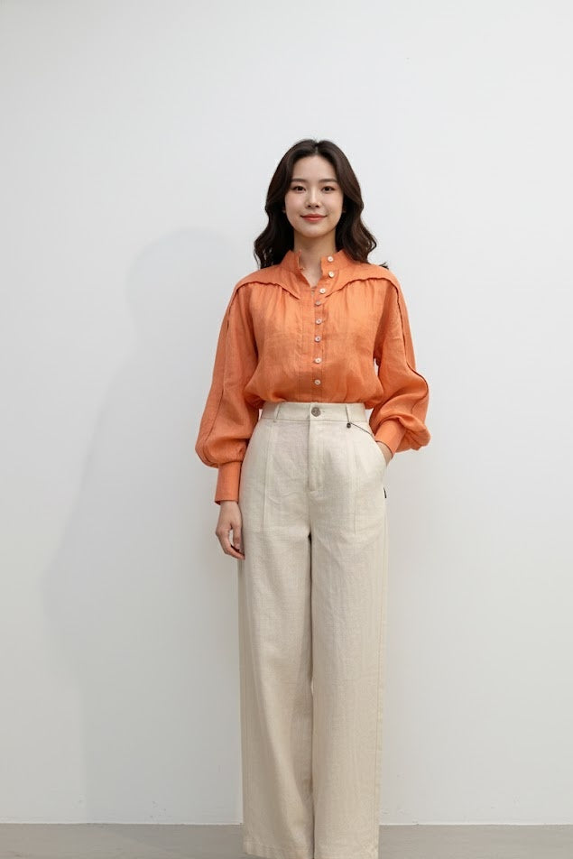 Chất liệu linen phối tơ cao cấp vừa giữ được độ mát và đứng form, vừa có độ rủ nhẹ, tạo cảm giác thanh thoát khi mặc. Áo có cổ sơ mi nhẹ nhàng, phần tay dài có thể điều chỉnh độ phồng bằng dây rút – giúp biến hóa phong cách linh hoạt: từ công sở thanh lịch đến dạo phố nhẹ nhàng.