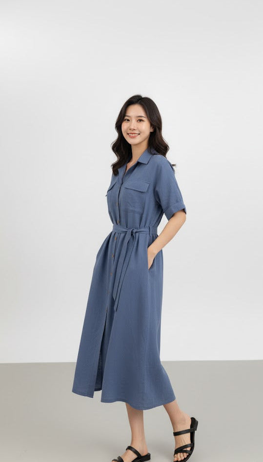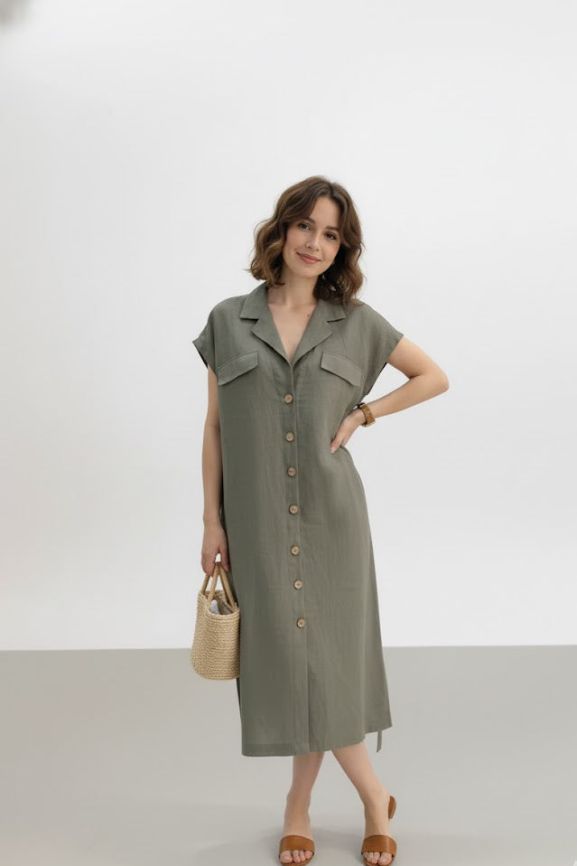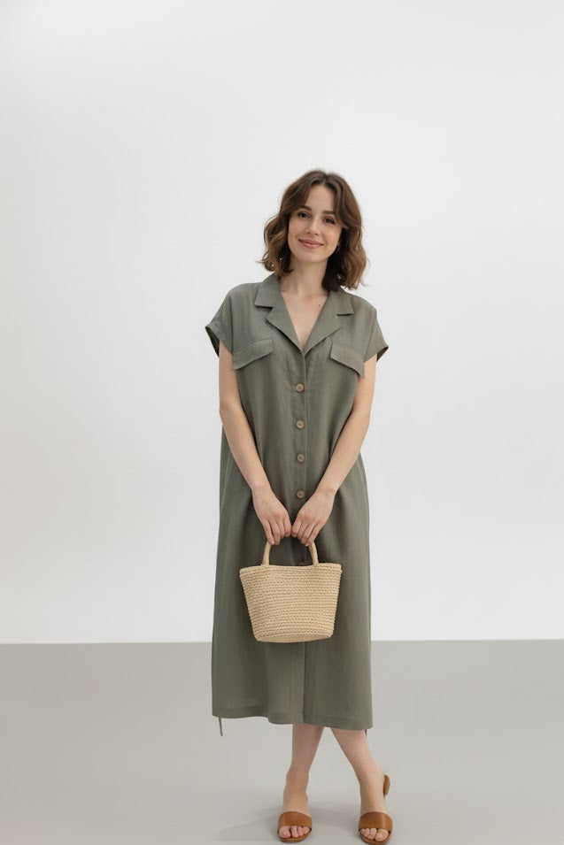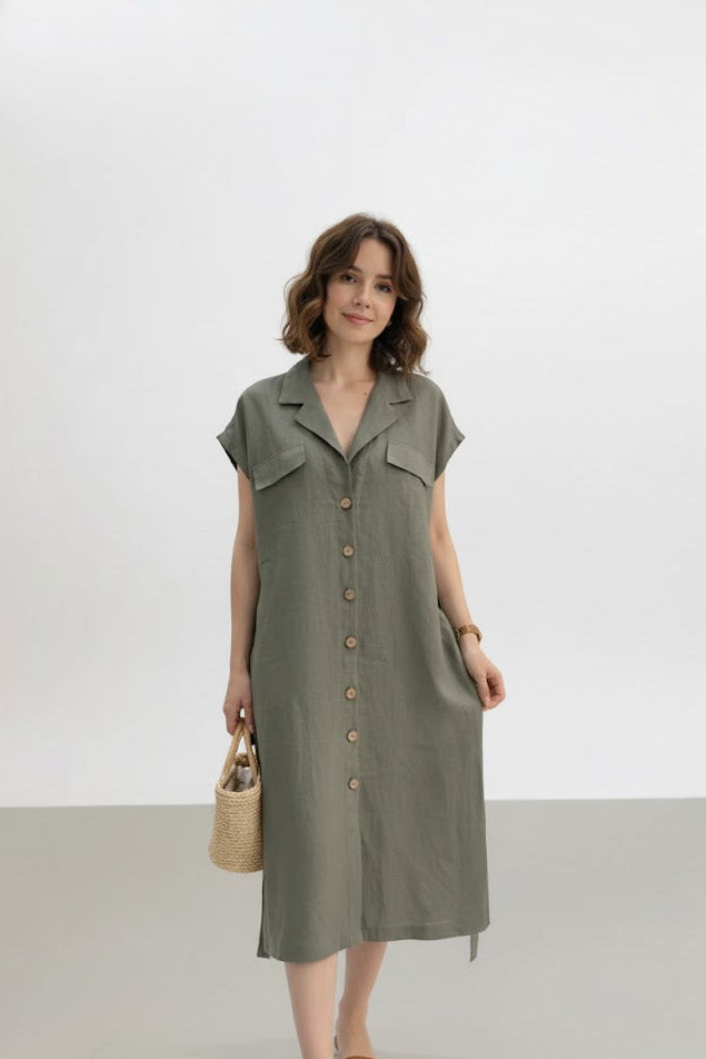 Chất liệu linen tự nhiên 100% giúp đầm thoáng mát, mềm mại và thấm hút tốt – lý tưởng cho thời tiết nắng nóng. Gam màu rêu trầm thanh lịch dễ phối với nhiều phụ kiện và phù hợp trong nhiều hoàn cảnh: đi làm, dạo phố, hay gặp gỡ bạn bè..