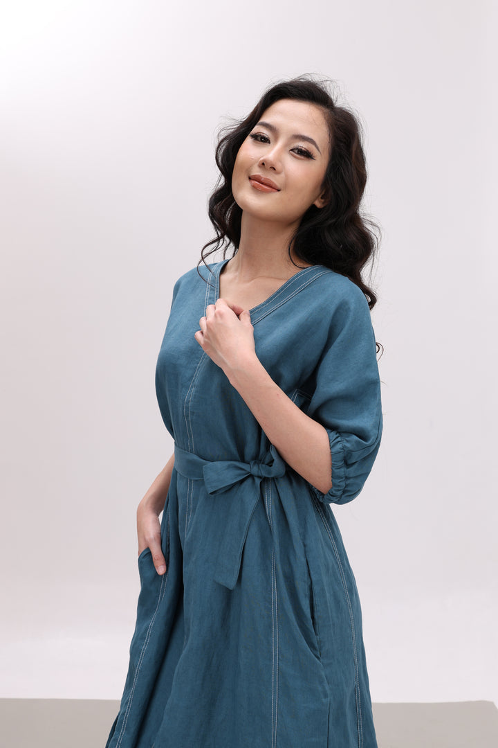 Chất liệu linen tự nhiên cao cấp – mỏng nhẹ, thoáng khí, có khả năng thấm hút tốt – cực kỳ lý tưởng cho thời tiết mùa hè oi bức hoặc các chuyến du lịch biển. Với vẻ đẹp đơn giản nhưng tinh tế, chiếc đầm này có thể mặc đi làm, dạo phố, đi cà phê hoặc tham dự các buổi tiệc nhẹ.