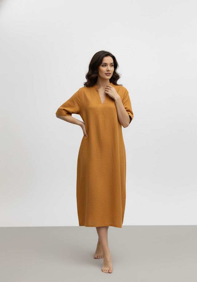 Đầm Linen Tưng Premium - Xếp Ly Vai Hất Cổ