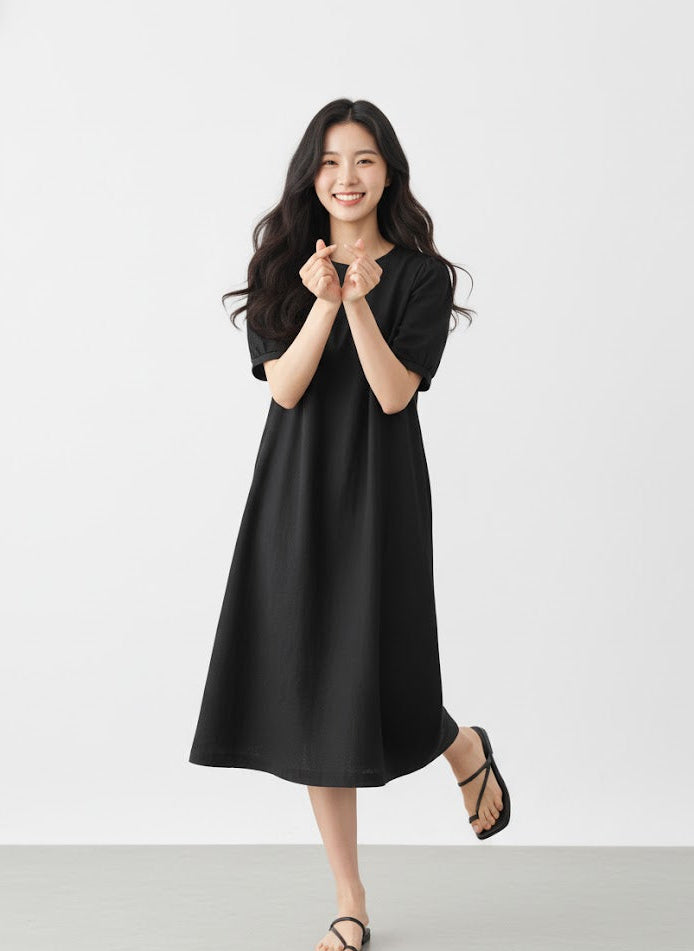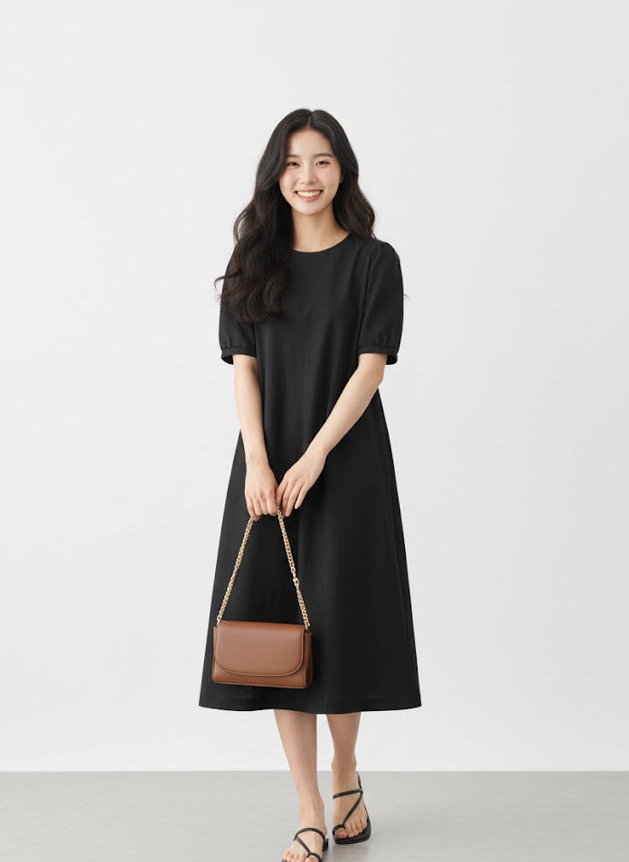 Chi Tiết Tinh Tế: (Nên thêm các chi tiết như: cổ tròn/cổ tim basic, túi hai bên tiện lợi, hoặc đường xẻ tà nhẹ nhàng,...) tạo nên sự hài hòa và tiện dụng cho chiếc đầm.